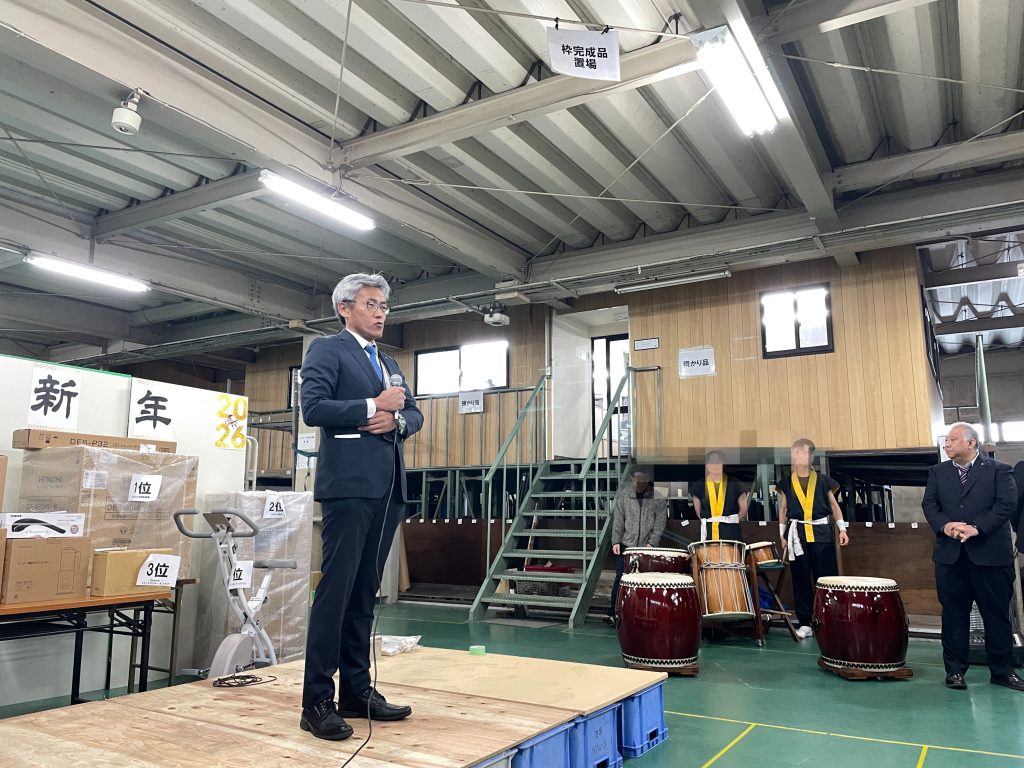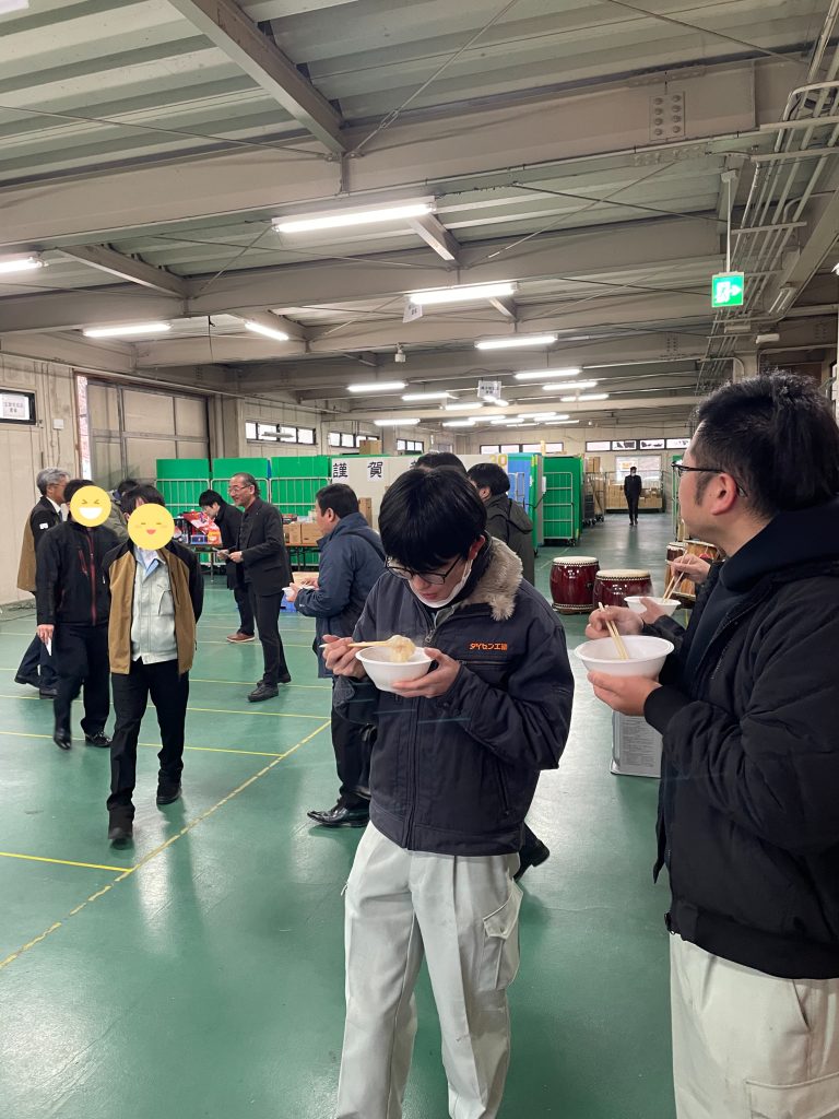 朝礼では、毎年恒例の白味噌のお雑煮をいただき、和やかな雰囲気の中で新年を迎えました。その後、和太鼓集団の祝い太鼓演奏後、社長および専務より新年のごあいさつがありました。
