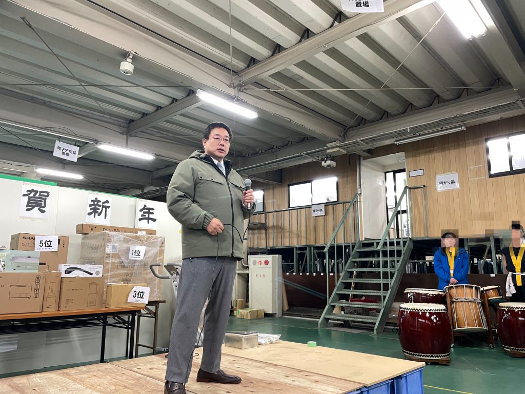 続いて、新ユニフォーム候補のお披露目を行い、最後は毎年恒例のくじ引き大会を開催しました。今年は、1等:衣類乾燥機、2等:冷凍庫、3等: ヘアードライヤー 、4等:クロスバイク、5等:空気清浄機といった高額商品をはじめ、健康グッズをテーマにした商品が総勢49名に当選しました。